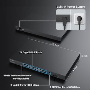 - ?Plug and Play? 24 portas Gigabit PoE e 2 portas RJ45 de 1G + 2 portas SFP de 1 G switch PoE não gerenciado, fácil configuração sem necessidade de instalação ou configuração de software. Não tem endereço IP ou interface web.
