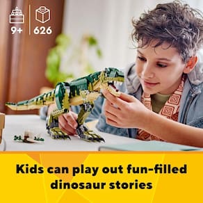 3 brinquedos de dinossauros para crianças em 1 conjunto – O conjunto LEGO Creator T. rex permite que meninos e meninas maiores de 9 anos construam e reconstruam 3 conjuntos de animais diferentes usando as mesmas peças Infinitas possibilidades de brincadeiras – As crianças vivem histórias com 3 brinquedos de dinossauro diferentes: vagando pela selva com o T. rex, correndo com o triceratops ou voando alto com o pterodáctilo Figuras de dinossauros articuláveis – O T. rex tem cabeça, cauda, mandíbula, pés, pernas, braços, dedos e calcanhares móveis, o triceratops tem pernas e cabeça móveis, e o pterodáctilo tem asas móveis Modelos de exibição – Todos os 3 modelos de dinossauros LEGO se sustentam por conta própria para serem exibidos pelas crianças em seus quartos após a brincadeira Presentes para fãs de dinossauros – Este brinquedo 3em1 é uma experiência de construir e brincar divertida e pode ser dado como um presente em qualquer ocasião para crianças que adoram ação com dinossauros Mais diversão 3em1 – Amplie a diversão com outros conjuntos (vendidos separadamente) da linha LEGO Creator 3em1, que inclui veículos, animais e astronautas Brinquedos LEGO Creator – Cada conjunto 3em1 permite que as crianças desfrutem de incontáveis horas de diversão construindo 3 modelos diferentes usando o mesmo conjunto de peças Medidas – Conjunto de construção LEGO de 626 peças com uma figura de Tyrannosaurus rex para construir que mede cerca de 15 cm de altura