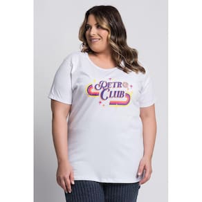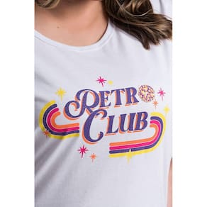 T-shirt feminina plus size elaborada em malha algodão. Possui Estampa na frente "Retro club", leve, macia e com inúmeras possibildades de uso. Monte looks desde casuais ao chiques, com aquele nozinho na frente, uma bermuda jeans e seu tênis favorito por exemplo e arrase! Para ficar em casa bem confortável, curtir um passeio ou trabalhar você terá a peça ideal. Encolhimento de 5% no comprimento.