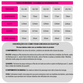 Medidas modelo: Manequim 50 - Altura 1,64 -Busto 112 - Cintura 108 - Quadril 135.