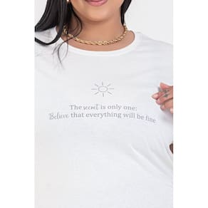 Tradução da estampa: THE SECRET IS ONLY ONE: BELIEVE THAT EVERTHING WILL BE FINE "O SEGREDO É UM SÓ: ACREDITAR QUE TUDO VAI FICAR BEM"