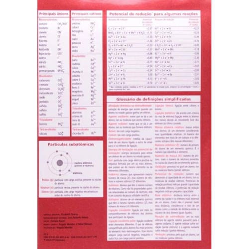 Material prático para consultas e estudo. Dados e informações atualizados por profissionais da área de acordo com as recomendações de 2012 da Iupac e da Iupap. Inclusão dos elementos 114 (fleróvio) e 116 (livermório) e revisão de massas atômicas relativas de todos elementos. Prática e maleável, em duas páginas, com formato ideal para consultas rápidas.