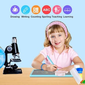 - Fácil de transportar - o tablet de desenho pesa apenas 150 gramas e as crianças mal conseguem sentir seu peso segurando-o. O comprimento é 9,45 polegadas, a largura é 6,89 polegadas e a espessura é 0,2 polegadas, facilitando a colocação em uma mochila, bolsa ou qualquer outra bolsa pequena. Você pode usar essa prancheta infantil em qualquer situação.