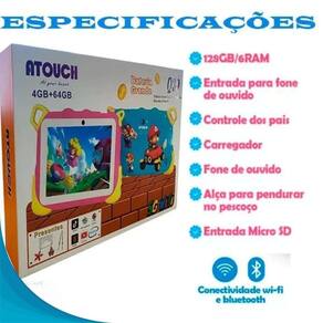 Características Tela de 7 polegadas com ótima qualidade de imagem Sistema android 11 com controle parental 8gb de ram e 256gb de armazenamento interno Câmeras de 2mp frontal e 8mp traseira Bateria de longa duração com 4000mah Conectividade wi-fi 4g e 5g Apps pré-instalados: netflix, youtube e tiktok com conteúdo infantil Capinha protetora para maior segurança Sem entrada para chip