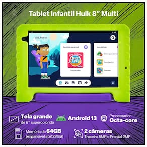 O Tablet Infantil Hulk Multi NB441 chegou para liberar o poder da diversao! Inspirado na forca do heroi mais poderoso da Marvel, ele combina desempenho, design tematico e seguranca para garantir uma experiencia incrivel as criancas.