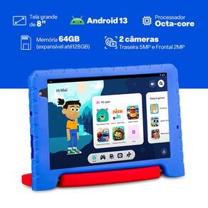 Marca: Multi Modelo: Tablet Infantil Mickey Wi-fi 6GB RAM 64GB Tela 8 Pol. Android 13 Octa-core Multi - NB438 Cor: Preto Tela: 8 Polegadas HD IPS 1280X800 Conexões: Wi-fi, Bluetooth Memória Interna: 64GB expansível até 128GB por cartão microSD -não incluso- Memória RAM: 6GB-4GB memória física + 2GB memória virtual- Sistema Operacional: Android 13 Processador: Octa-core Capacidade da Bateria: 4.000mAh Câmera frontal: 2MP Câmera traseira: 5MP Voltagem: Bivolt Dimensões -LxAxC-: 11.6 x 1.3 x 19.2cm Peso: 500g Conteúdo da embalagem: 1 Tablet M8 Wi-Fi, 1 Cabo USB tipo C, 1Guia rápido, 1 Carregador, 1 Case de silicone Mickey Certificado Anatel: 03790-24-03111 Garantia: 1 ano