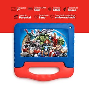 O Tablet Infantil Avengers e um tablet com acesso seguro a internet para entreter a crianca na companhia do Homem de Ferro, Thor, Hulk e Capitao America.