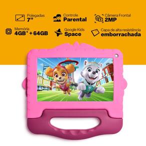 Marca: Multi Modelo: Tablet Multi Patrulha Canina Skye com Controle Parental 7 pol 4GB RAM 64GB Android 13 Quad Core + Case + Wi-fi - NB422 Cor Principal: Rosa Tela: 7 Pol Conexoes: Wi-fi, Bluetooth Memoria Interna: 64GB expansivel ate 128 GB por cartao microSD -nao incluso- Memoria RAM: 4GB -2GB interno + 2GB memoria virtual - Sistema Operacional: Android 13 -Go edition- Processador: Quad Core Capacidade da Bateria: 2.800mAh Camera frontal: 2MP Dimensoes -LxAxC-: 11.6 x 1.3 x 19.2cm Peso: 500g Certificado Anatel: 07453-18-03111 Garantia: 1 ano