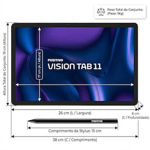 Conteúdo da embalagem: 1 x Tablet Positivo Vision Tab 11. 1 x Caneta Vision Pen. 1 x Capa Protetora. 1 x Carregador de 10W. 1 x Cabo de dados (USB-C). 1 x Ferramenta para remoção do cartão SIM. 1 x Manual do usuário.