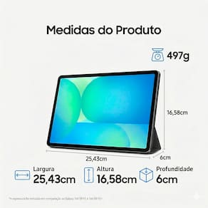 Especificações: Cor: Cinza. Processador: Octa-Core. Memória RAM: 8 GB. Conectividade: Suporte para redes 5G, Wi-Fi 6 e Bluetooth. Armazenamento Interno: 128 GB, expansível até 1 TB via cartão MicroSD. Tela: 10,9" com taxa de atualização de 90Hz e tecnologia para visualização nítida em ambientes externos. Câmeras: Traseira: 13 MP. Frontal: 12 MP Ultra Wide (ideal para videochamadas). Bateria: Longa duração com suporte para carregamento rápido. Resistência: Certificação IP68 (resistente à água e poeira) tanto o tablet quanto a S Pen. Sistema Operacional: Android 15. Segurança: Samsung Knox integrado. Diferenciais: Inclui Caneta S Pen na caixa, suporte para Samsung DeX e som imersivo. Dimensões: 25 x 16 x 6 cm (AxLxC)