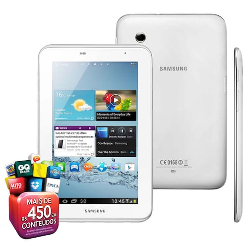 Com um design super fino e leve o Galaxy Tab 2 7.0 permite que você o leve para qualquer lugar. É possível manuseá-lo com apenas uma mão, ideal quando você está em movimento. O Samsung Galaxy Tab 2 7.0 possui alta produtividade com seu processador Dual Core de 1.0 GHz, Internet com conexão Wi-Fi, sistema operacional Android 4.0 e câmera 3.2MP mais câmera frontal para vídeo chamadas. Com o Samsung Galaxy Tab 2 7.0 você tem navegação igual ao do computador. Acesse milhões de conteúdos multimídia online em qualquer página WEB, assista vídeos online, filmes, canais de esporte e jogos web sem restrições e direto em sua super tela de 7 polegadas de alta resolução.
