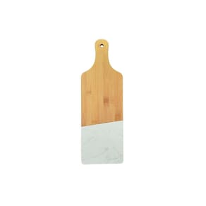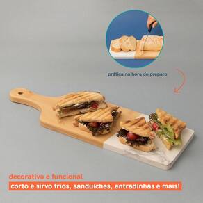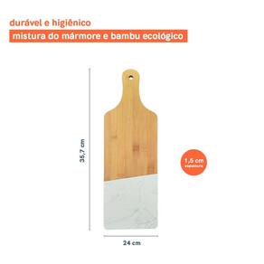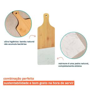 :: Essa é a tábua de bambu e mármore da OIKOS. :: Multiuso: para servir e cortar frios, sanduíches, entradinhas e mais! :: Design decorativo: além de ser prática na hora do preparo, ela também se encaixa muito bem na decoração - a mistura de bambu e mármore dá um toque moderno na casa. :: Dupla face: pode ser usada tanto de um lado como do outro, você que manda. :: Durável e higiênico: o bambu é um material com propriedades que evitam a proliferação de bactérias e é bem resistente, como o mármore. :: Fácil de lavar: basta higienizar com detergente neutro e guardar quando estiver bem seca - ou deixar pendurada, fica bem bacana também.