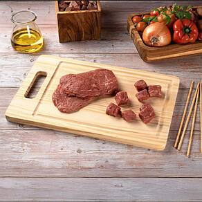 Essa tábua de corte é perfeita pra quem curte praticidade na cozinha ou no churrasco Feita em madeira Pinus, ela tem um formato retangular clássico, canaleta para escorrer a gordura e alça, facilitando o manuseio e evitando bagunça na hora de cortar a carne.