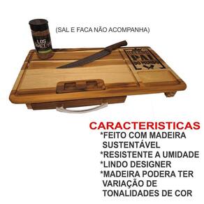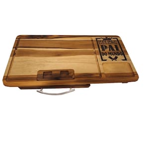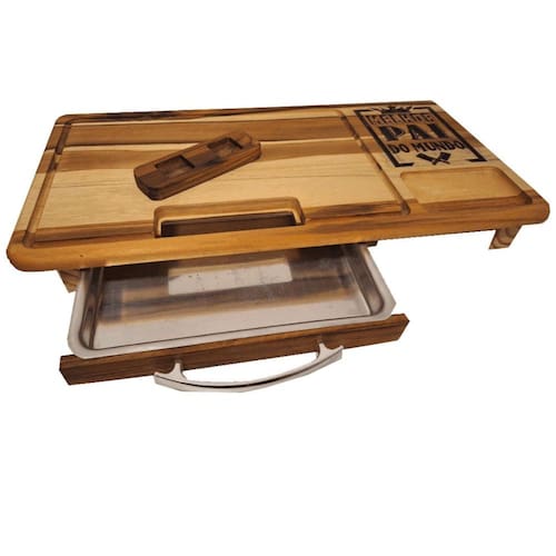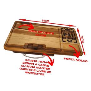 Tabua de churrasco com gaveta melhor pai do mundo presente Tábua de carne com gaveta feita em madeira naval teca Otima resistencia Desenhos em alto relevo usinados e pintados Acabamento em óleo vegetal Lixada Tábua acompanha uma assadeira número 1 baixa em alumínio e uma tampa para o recipiente de carne, também um recorte para encaixar a latinha de cerveja da sua marca preferida. : Ótimo presente para quem adora um churrasco. As cores podem sofrer variações em relação a foto por conta da madeira. Medidas: 60x30x7cm