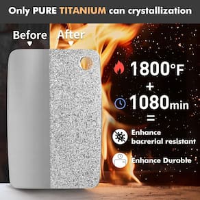 - Tratamento cristalizado: Somente titânio puro pode cristalizar. Nossa placa de titânio é cristalizada em temperaturas de até 982 °C. A cristalização de titânio é um acabamento incrível! Tem ótima aparência e possui propriedades doces em termos de biocompatibilidade, anticorrosão e resistência a mofo e bactérias. É única, como uma impressão digital, mostrando sua extraordinária singularidade e charme.