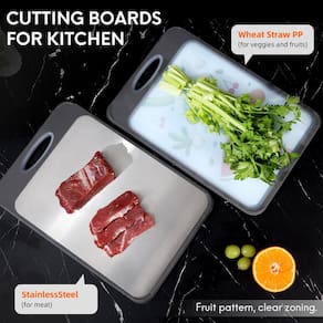 - Segura e saudável: feita de materiais de tábua de corte composta premium, é uma tábua de corte saudável para cozinha sem plástico. As tábuas de corte de aço inoxidável para o lado da cozinha são muito fáceis de manter limpas, o lado PP da palha de trigo de qualidade alimentar não deixa marcas de corte. Ideal como uma tábua de corte antiderrapante para cozinha para famílias ocupadas