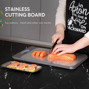 - ?Máxima versatilidade?Esta grande tábua de corte de aço inoxidável combina a durabilidade das tábuas de corte de metal para cozinha com a praticidade das tábuas de corte não plásticas para cozinha. O lado de aço inoxidável é perfeito como uma tábua de corte de carne crua, o lado PP de palha de trigo (marcado com padrões de frutas claros) garante uma preparação segura para frutas e legumes. Uma verdadeira tábua de corte inteligente que separa ingredientes crus e cozidos sem esforço