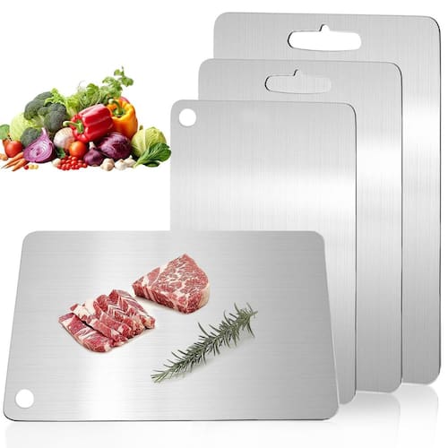 - ?Mais saudável e segura?Nossas tábuas de corte são feitas de titânio 100% puro, que é um material confiável para implantes cirúrgicos. Ao contrário das tábuas de corte de madeira e plástico, a tábua de corte de titânio puro não absorve líquidos e é fácil de limpar, não deixa odores ou resíduos sutis de alimentos, tornando-as uma escolha saudável para sua cozinha