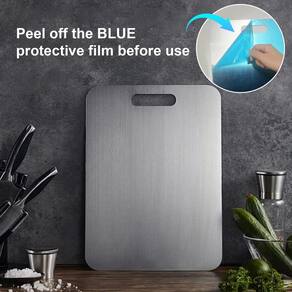 - Tábuas de corte de titânio de alta qualidade: feitas de grau alimentício SUS de alta qualidade. Feita de titânio puro. Resistente à corrosão, à prova d'água, à prova de ferrugem e sólida, pode ser lavada na lava-louças. Retire a película protetora da superfície azul antes de usar.