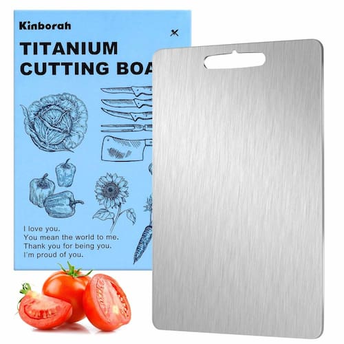 - Dureza amigável à faca: Preserve a nitidez da sua faca com nossa tábua de cortar de titânio. Sua dureza garante uma experiência de corte perfeita, protegendo suas lâminas de embotamento ou danos