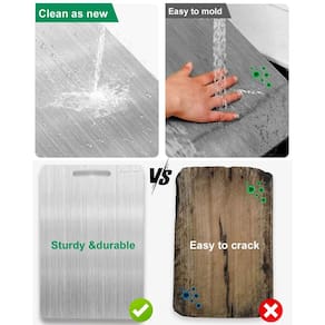 - Segurança sem plástico: nossa tábua de cortar titânio oferece uma alternativa mais segura e saudável às tábuas de plástico, eliminando o risco de partículas de plástico contaminarem seus alimentos durante a preparação dos alimentos