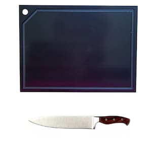 Tabua de corte em polietileno virgem não reciclado PEAD, um material de alta qualidade, resistente, de fácil lavagem, atóxico. Sem manchas. COM canaleta ou furo para pendurar Faca de aço Inox de 9 com cabo de madeira e caixa de presente, modelo Churrasco Fabricadas em plástico de alta qualidade, o PEAD polietileno é um material atóxico, Aprovado e orientado pela Vigilância Sanitária ANVISA pra utilização em cozinhas residenciais ou profissionais, Devido ao desempenho e facilidades do produto, aliado a segurança e manuseio dos alimentos. As diversas cores sugerem uma tábua para cada tipo de alimento, seguindo as normas internacionais de padrão de qualidade, Evitando assim a contaminação cruzada. Tamanho: Altura: 8mm Largura: 245mm Comprimento : 330mm Cor: Preta Ean: 7427014031180