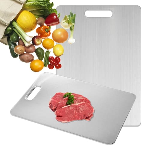 Tábuas de corte de titânio 100% puro para cozinha, 1 pacote de tábua de corte de titânio de grau alimentício. Design de dupla face, frente para cortar frutas e legumes, traseira para cortar carne para evitar uso cruzado, seguro e higiênico. As tábuas de corte de titânio são extremamente resistentes e duráveis, resistindo a cortes, ranhuras e perfurações, sem odor, sem serragem. Fácil de limpar e transportar, é um item essencial para acampamento doméstico e externo - Nova tábua de corte de titânio: a tábua de corte de titânio otimizou as falhas da maioria das tábuas de corte. A tábua de corte médica de grau alimentício 100% de titânio puro evita que partículas de plástico contaminem sua comida. Estudos descobriram que, se você cortar alimentos em uma tábua de corte de plástico, você comerá em média 50 g de microaparas de plástico por ano! A tábua de corte de titânio tem uma superfície não tóxica que não libera produtos químicos ou deixa aparas - Uso frente e verso, fácil de limpar: é feito de titânio puro e pode ser utilizado em ambos os lados. A parte frontal é para cortar frutas e legumes, e a parte traseira é para cortar carne para evitar uso cruzado, oferecendo espaço suficiente para todas as suas necessidades de corte. Alimentos e líquidos não grudam na tábua de corte de titânio. Basta enxaguar com água da torneira e pode ser utilizado novamente - Durável e resistente a rachaduras: nossas tábuas de corte de metal de titânio para cozinha são projetadas para serem extremamente resistentes e duráveis, resistindo a cortes, ranhuras e furos. A tábua de corte produzida por processos rigorosos não é propensa a deformação ou quebra. As tábuas de corte de titânio podem suportar uma grande quantidade de uso nos próximos anos - Estabilidade antiderrapante e design versátil: aproveite sessões de corte estáveis com nossa prancha. Ao colocar uma toalha embaixo, você pode efetivamente evitar que a tábua de cortar deslize durante o uso, garantindo uma experiência de corte segura. a alça prática torna a tábua de corte fácil de mover, armazenar e pendurar, mantendo sua cozinha arrumada - Amplas aplicações: a tábua de corte de titânio é adequada para uma variedade de tarefas culinárias, incluindo cortar carne, frutas e legumes, bem como amassar massa e fazer pão na tábua de corte, e não deixa manchas ou odores. Facilite a preparação de refeições com o recurso de descongelamento rápido da nossa tábua de corte de carne. É uma tábua de corte essencial para acampamento doméstico e externo (lembre-se de retirar a película protetora azul antes de usar.)