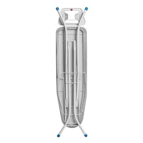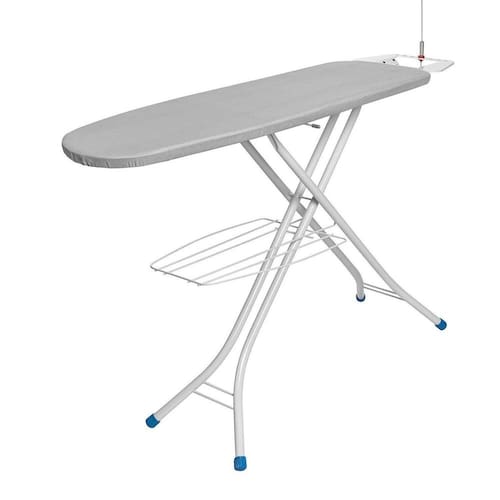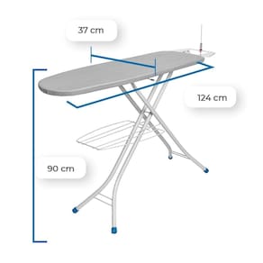 O tampo em chapa de aço expandida minimizada é leve e eficiente, contando com furos de 0,6 cm x 0,3 cm que permitem a passagem do vapor do ferro, prevenindo o acúmulo de umidade, mofos e bactérias. Suas dimensões generosas de 124 cm x 37 cm garantem espaço suficiente para manusear roupas maiores com facilidade.