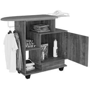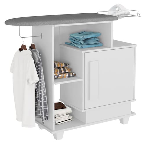 Estrutura: : : : : : MDPAcabamento: : : : : : Pintura U.V, acabamento brilho Porta: : : : : : Sim, 01 porta de abrir/fechar, com dobradiças metálicasPrateleira: : : : : : Sim,Tampo da Tabua: : : : : : Prancha em MDP revestida com tecido antitérmicoCabideiro: : : : : : Sim, em metalPorta Ferro: : : : : : Sim, em metalPuxador: : : : : : Sim, em MDF Pés: : : : : : Sim, 04 pés: : : : : :