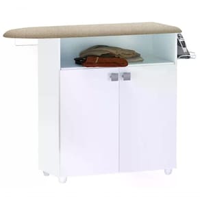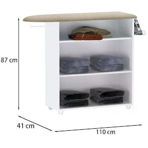 Tábua de Passar Roupas Bianca, é ideal para quem busca qualidade e sofisticação. Estrutura em MDP de 12 e 15 mm, acabamento em pintura UV (Fosco/Brilho). Composta por tampo estofado com espuma e revestido com tecido (cor do tecido: , podendo variar de acordo com o lote de fabricação), 02 portas com dobradiças metálicas, prateleira interna resistente, suporte aramado para colocar o ferro de passar, cabideiro que facilita a acomodação das roupas já passadas, nicho, puxadores em PVC, e acompanham pés em PVC. Perfeita para sua área de , proporcionando praticidade no dia a dia dos afazeres domésticos. Este móvel chegará na sua casa separado em 01 volume.