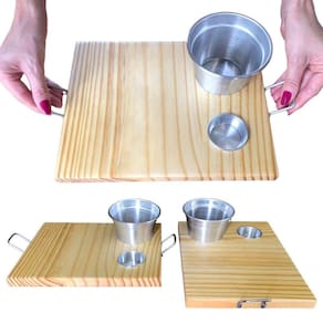 Fabricada em madeira com acabamento arredondado nas bordas superiores, com 1 molheira em alumínio de capacidade aproximada 25ml, 1 recipiente para batata frita em alumínio com capacidade aproximada de 500ml 180g batata palito , com cabos ergonômicos também em alumínio proporcionando charme e praticidade para servir.