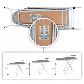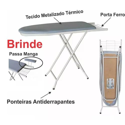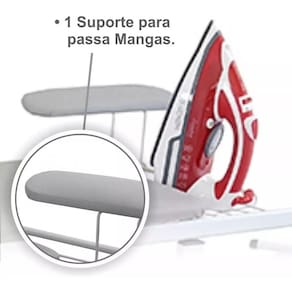 Completa com suporte aramado para o ferro de passar, onde não é necessário utilizar a área da prancha para colocar o mesmo, além do passa mangas trazendo ainda mais facilidade na passagem de camisas, camisetas e blusas. O modelo acompanha três regulagens de altura para escolha da mais adequada garantindo maior estabilidade.