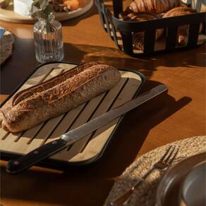 Seu diferencial está na tábua de corte com sulcos para recolher migalhas, mantendo a bancada sempre limpa.