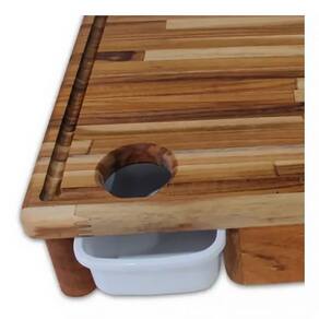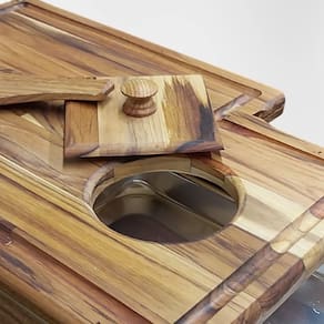 A madeira teca é conhecida por sua resistência e durabilidade, garantindo que sua tábua não só terá uma longa vida útil, mas também manterá a qualidade do sabor da carne, sem deixar gosto residual. A gaveta embutida é um diferencial que permite armazenar a carne cortada, mantendo-a protegida e na temperatura ideal, longe de mosquitos e outros insetos, enquanto você continua a churrasquear. Além disso possui um sistema de limpeza (dispenser) para as partes que deseja descartar da carne, mantendo organizada.