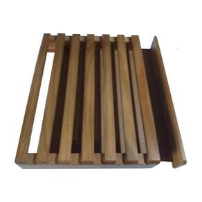 Especificações técnicas: - Material: Madeira - Tamanho: 32x25x5cm - Acompanha faca com cabo vermelho e lâmina de inox recoberta por titanium - Gaveta embutida para remoção das migalhas