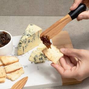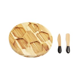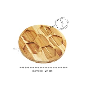 Petisqueira em madeira com compartimentos, espatula e faquinha. A tabua possui um design que lembra bola de futebol, atual e pratico. Tabua em madeira resistente a umidade, pragas, antibacteriana e ecologicamente correta, proveniente de reflorestamentos. O jogo de utensilios em bambu para antepastos e queijos sao perfeitos para retirar e servir petiscos. Contem: 1 Espatula de Bambu 1 Faca de Queijo Bambu Medidas: 14 x 3 cm 1 Tabua Petisqueira Diametro: 27 cm Altura: 1,8 cm Material: Madeira Teka
