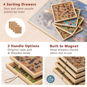 Vem com 4 gavetas, o que permite que você separe as peças do quebra-cabeça e armazene seu jogo inacabado.