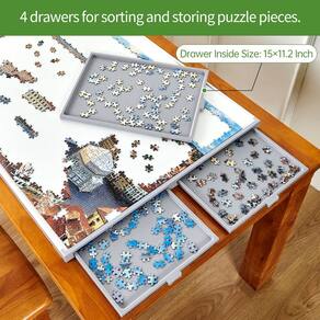- Superfície de trabalho de 35 × 26 polegadas para quebra-cabeças de até 1500 peças. (CERTIFIQUE-SE DE QUE O TAMANHO DO SEU QUEBRA-CABEÇA SE ENCAIXA NESTE TABULEIRO). 4 gavetas para classificar e armazenar peças do quebra-cabeça.