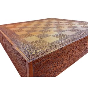 Acabamento: produzido artesanalmente; pintado nos mínimos detalhes à mão Material: fibra de vidro Medidas: a: 45 x l: 45 x p: 7cm; tamanho das casas: 4,5 x 4,5cm Referência do produto: 831 Idade recomendada: 6 anos Recomendações: este tabuleiro é recomendado para as peças em resina ou as peças em ferro.