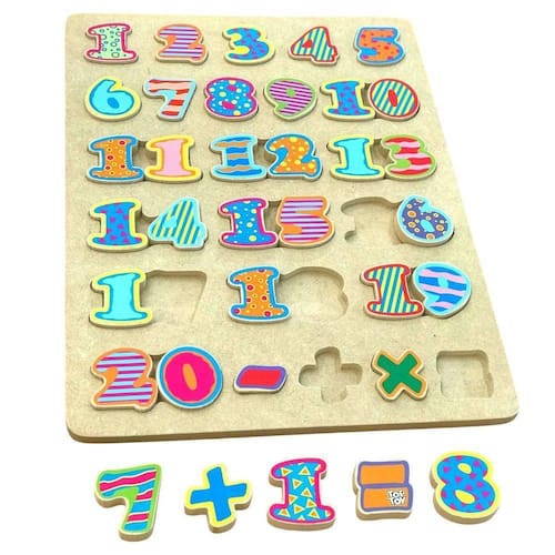 Umtabuleiro composto pornúmeros de 1 a 20 e sinais matemáticos de aproximadamente 5 cm, recortadas em madeira e divertidamente coloridas, que auxilia no estímulo da aprendizagem e alfabetização.