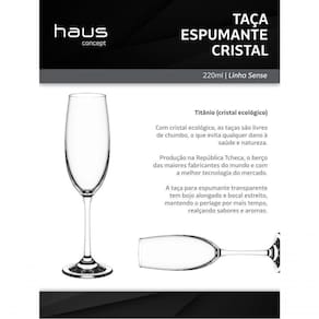 A elegância e estilo são os diferencias da taça para Espumante Haus Concept 220 ml em titânio (cristal ecológico). Produto importado é integrante da linha Sense, família Cristais. Os copos e taças da Haus possui titânio em sua composição, o que imprime mais resistência, brilho e transparência as taças. Com cristal ecológico, as taças são livres de , o que evita qualquer dano à saúde e natureza. Com bojo alongado e bocal estreito, a taça de espumante é desenvolvida para manter o perlage por mais tempo, realçando sabores, aromas e o frescor da bebida. A haste evita que o calor da mão seja transmitido para a bebida, e garante que seja servida em uma taça para permanecer fria por mais tempo. Os produtos em cristal da Haus Concept são produzidos na República Tcheca, o berço das maiores fabricantes do mundo e com a melhor tecnologia do mercado. A taça para espumante com capacidade de 220 ml com diâmetro de 6,6 cm e 22,5 cm de altura. Com certeza a taça para espumante Haus Concept é perfeita para todos os entusiastas do estilo diferenciado e dos bons momentos. O cristal com titânio - material de que as taças são compostas - é muito mais resistente que uma taça de cristal comum. Apesar da sua espessura fina elas são altamente resistentes a impactos e a mudanças de temperatura. Alinhando resistência, praticidade e design, a Haus Concept é uma das marcas que pertencem ao Grupo Brinox, um dos maiores fabricantes de utilidades domésticas do país. Localizado na cidade de Caxias do Sul, na Serra Gaúcha e expandindo permanentemente a sua atuação no mercado externo, o Grupo Brinox possui canais de exportação nos cinco continentes e atua ativamente em mais de vinte países. Através de suas marcas, Brinox, Coza e Haus Concept, oferece um mix de mais de 6 mil itens, e segue com seus planos de expansão como um grande participante no mercado de utilidades domésticas.
