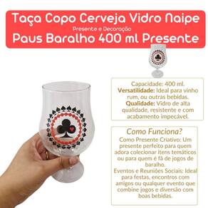 Ideal para quem busca um copo que combine praticidade com estilo. Torne sua próxima experiência de degustação de cerveja ainda mais especial com a Taça Copo de Cerveja em Vidro Naipe Copas Baralho 400 ml