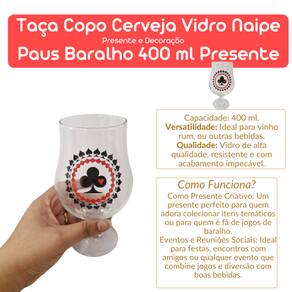 Para Apreciar Cervejas: Sirva sua cerveja gelada favorita com muito mais estilo e charme, aproveitando o design exclusivo. Como Presente Criativo: Um presente autêntico para quem adora artigos colecionáveis ou para aqueles que se divertem com um bom jogo de baralho. Decoração de Bar ou Cozinha: Adicione um toque elegante e temático ao seu bar ou cozinha, destacando esse copo como peça-chave da decoração. Eventos Sociais e Reuniões: Ideal para servir bebidas em festas ou encontros descontraídos, combinando o prazer de beber com o prazer de jogar.