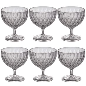 Kit com 6 taça de plástico para sobremesa com capacidade para 350ml. Produto integrante da linha Cristal Glamour, possui superfície facetada, seguindo as principais tendências do segmento de mesa posta e decoração. Produto versátil, possibilita infinitas produções casual ou chique. É produzido em material atóxico e livre de BPA e pode ser levado ao freezer.
