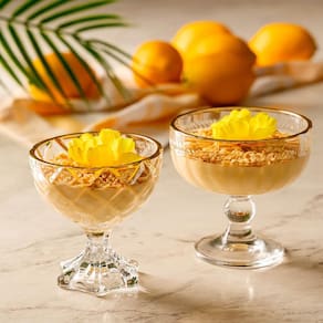 A taça para sobremesa da Lyor é fabricada em cristal, na cor transparente com borda dourada, de grossa espessura para garantir a durabilidade e qualidade do produto. As taças possuem 200mL de capacidade, 9,2cm de altura e 10cm de diâmetro.