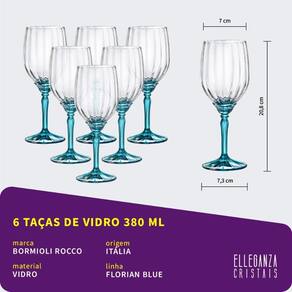 Jogo com 6 taças de vidro para vinho 380 ml linha florian blue bormioli roccodetalhes do produtomaterial: vidroorigem: produto importado da itáliaproduto: taça de vidroquantidade: 06 taçascapacidade: 380 ml cada taçatamanho: 20,8 cm de altura, 7 cm de diâmetro de bocal e 7,3 cm de diâmetro de basemarca: bormioli roccolinha: florian blueembalagem: os produtos são cuidadosamente envolvidos por plástico bolha e entregues na caixa do fabricante, inserida em outra caixa reforçada para assegurar a integridade do produto no transporte. Substituímos produtos danificados no transporte.Enviodespachamos nossos produtos no prazo de 01 a 02 dias úteis após a compra.As informações de envio estão disponíveis no momento da compra.Trocas e devoluçõesseguimos todas as normas vigentes no código de defesa do consumidor.Adicionalmente, trocamos produtos danificados no transporte.Solicitamos o envio de foto demonstrando o ocorrido por mensagem e efetuaremos a troca com prioridade e sem custo para você.Informações relevantesjá imaginou beber ou servir suas bebidas em taças ou copos com classe e sofisticação A elleganza cristais comercializa produtos com preços excepcionalmente abaixo do mercado e de qualidade assegurada. Trabalhamos com produtos de espessuras variadas, livre de materiais tóxicos, com design e transparência incríveis.Sobre a bormioli roccoa bormioli rocco exporta seus produtos para mais de 100 países no mundo e representa uma das vidrarias mais importantes no cenário internacional.Fundada em 1825 na itália, hoje está dividida em duas áreas de negócio, como artigos para mesa, louça e vidros em geral. Possuem três fábricas de produção, dois estúdios de decoração, seis filiais comerciais e seis lojas próprias. Ean: 8004360095180