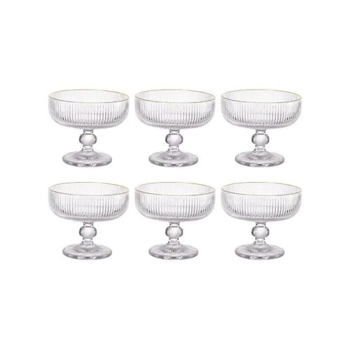 Jogo de 6 taças para sobremesa em vidro com borda dourada 310ml o jogo de taças para sobremesa em vidro é composto por 6 peças, cada uma com capacidade de 310ml. As taças são feitas em vidro de alta qualidade, o que garante sua durabilidade e resistência a impactos. Além disso, o jogo de taças para sobremesa em vidro é fácil de limpar e pode ser lavado à máquina. Se você está procurando um conjunto de taças para servir sobremesas com estilo e elegância, este jogo é uma excelente escolha.