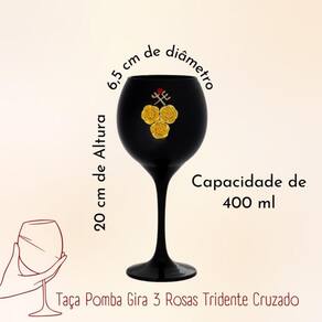 Taça Preta Pomba Gira 3 Rosas Trid Cruz 400 ml 20cm Celebra Celebre a tradição e a beleza com a Taça Preta Pomba Gira 3 Rosas Tridente Cruzado. Esta taça encantadora, com capacidade para 400 ml e uma altura de 20 cm, é uma peça excepcional para rituais, cerimônias ou decoração de alta qualidade. Detalhada com um elegante tridente cruzado e adornada com três delicadas rosas, esta taça incorpora a essência da Pomba Gira, uma divindade venerada em várias tradições espirituais. Material: Vidro Diâmetro: 6,5 cm Tamanho: 20 cm de altura Capacidade: 400 ml Mililitros Ao lavar evitar fricção excessiva para não comprometer o brilho da peça - O acabamento é impermeabilizado para dar mais durabilidade e não comprometer a pintura. Também oferece um bom acabamento com brilho. Imagens meramente ilustrativas Tire todas as suas dúvidas antes de concluir a compra. Iremos responder o mais breve possível. Embalagem de Envio: Caixa de papelão ondulado, plástico bolha. Respostas das dúvidas mais frequentes na ordem: R1: Já realizamos milhares de entregas em todo o Brasil, somos especialistas no que fazemos. R2: Assim que seu pedido for despachado, esta plataforma envia para você o código de rastreamento. R3: Enviamos o produto 100% inspecionado e conferido em nosso checkout e são embalados em embalagem de papelão e plástico bolha. R4: O tempo de entrega irá depender totalmente do seu CEP, todos os nossos produtos saem de Capital. R5: Iremos despachar o seu produto o mais rápido possível, assim que for confirmado pela plataforma, enviamos em até 24h. R6: Nós queremos a sua satisfação, qualquer problema iremos te auxiliar em nossos canais de comunicações. Ean: 7890003943663 Marca: Não Informado