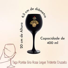 Taça Preta Pomba Gira Rosa Leq Trid Cruz 400ml 20cm Celebra Celebre a energia da Pomba Gira com esta deslumbrante Taça Preta adornada com rosa, leque e tridente cruzado. Com capacidade para 400ml e medindo 20cm de altura, esta taça é uma adição impressionante para seus rituais e celebrações espirituais. Feita com cuidado e atenção aos detalhes, esta taça incorpora símbolos significativos da Pomba Gira, incluindo uma rosa que representam sua beleza e paixão, um leque simbolizando sua influência e poder, e um tridente cruzado representando sua conexão com os domínios espirituais. Material: Vidro Diâmetro: 6,5 cm Tamanho: 20 cm de altura Capacidade: 400 ml Mililitros Ao lavar evitar fricção excessiva para não comprometer o brilho da peça - O acabamento é impermeabilizado para dar mais durabilidade e não comprometer a pintura. Também oferece um bom acabamento com brilho. Imagens meramente ilustrativas Tire todas as suas dúvidas antes de concluir a compra. Iremos responder o mais breve possível. Embalagem de Envio: Caixa de papelão ondulado, plástico bolha. Respostas das dúvidas mais frequentes na ordem: R1: Já realizamos milhares de entregas em todo o Brasil, somos especialistas no que fazemos. R2: Assim que seu pedido for despachado, esta plataforma envia para você o código de rastreamento. R3: Enviamos o produto 100% inspecionado e conferido em nosso checkout e são embalados em embalagem de papelão e plástico bolha. R4: O tempo de entrega irá depender totalmente do seu CEP, todos os nossos produtos saem de Capital. R5: Iremos despachar o seu produto o mais rápido possível, assim que for confirmado pela plataforma, enviamos em até 24h. R6: Nós queremos a sua satisfação, qualquer problema iremos te auxiliar em nossos canais de comunicações. Marca: Não Informado