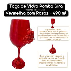Taça de Vidro Pomba Gira Vermelha com Rosas - 490 ml A Taça de Vidro Pomba Gira Vermelha com Rosas é uma peça especial, com capacidade para 490 ml, criada para ser utilizada em altares de Umbanda e Candomblé. Com seu design vibrante e simbólico, a taça homenageia Pomba Gira, entidade de grande poder e transformação. A cor vermelha, associada à força e ao amor, juntamente com as rosas, símbolos de beleza e paixão, traz uma energia intensa e acolhedora para as práticas espirituais. Feita de vidro de alta qualidade, esta taça é resistente e perfeita para complementar seu altar ou espaço sagrado. Características: